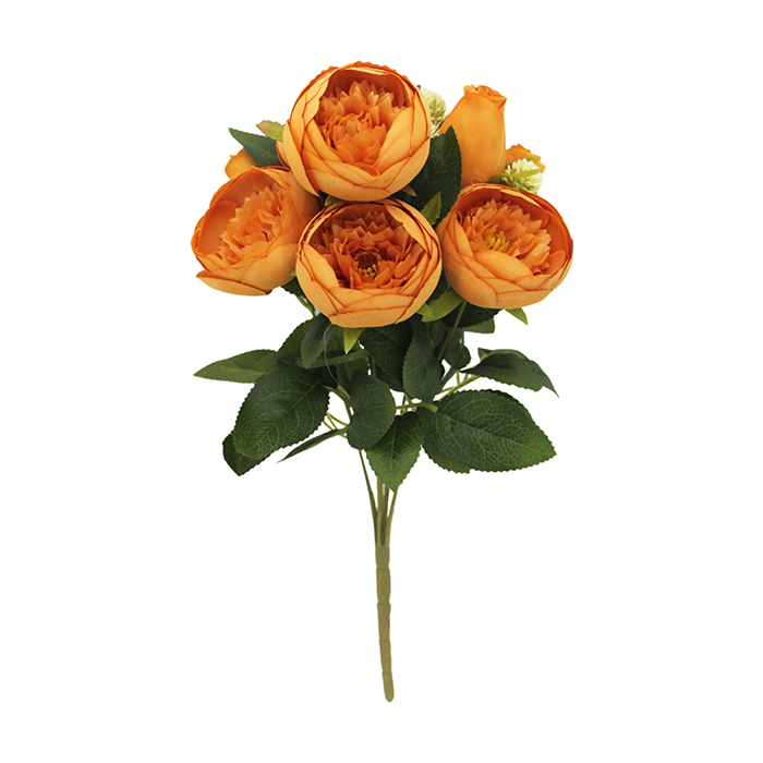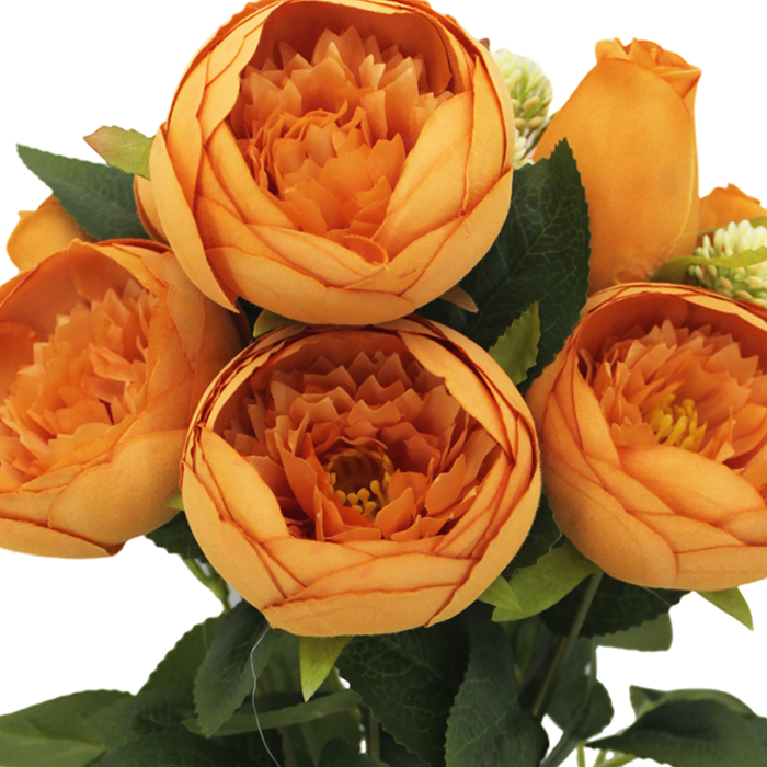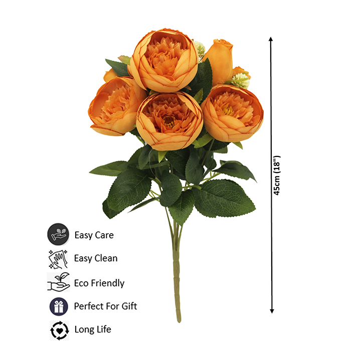The Peony flowers shape is broad and thick. It is called the king of flowers. It has the meaning of perfection, passion, wealth and elegance, Life, expectation, light love, pay with heart. A person who is noble, dignified, elegant, graceful, beautiful and trustworthy. The bunch has nine flowers with silky look. These are looking realistic natural even people calls with Artificial Peony Flower, Artificial Orange Flower, artificial floral decoration.