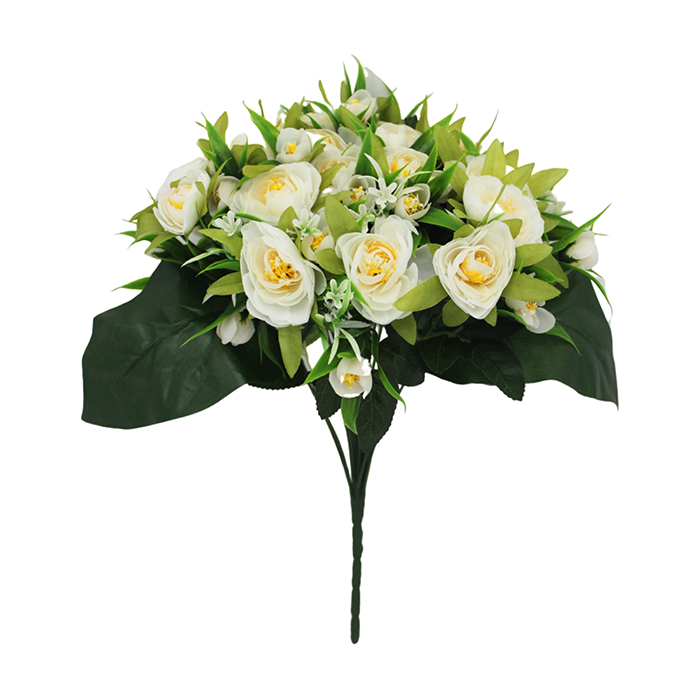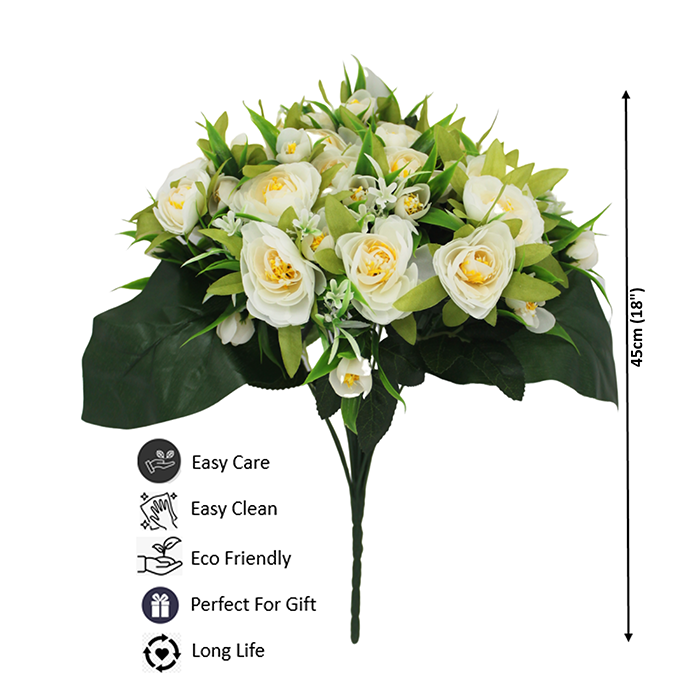 Big Bunch of Artificial White Small Round Rose Flowers with Buds and Green Leaves (18 Heads)