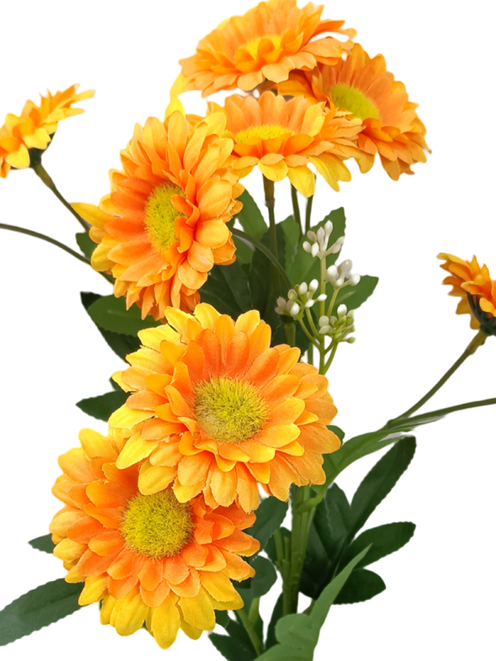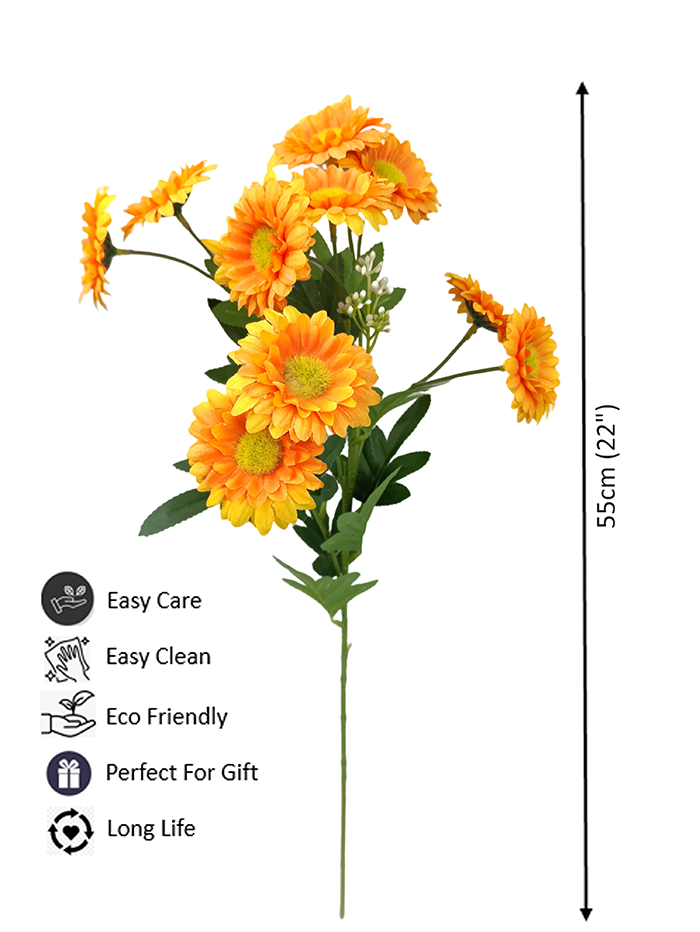 Upgrade your living space with the premium Daisy flowers in a classic, eye-catching design. This beautiful, lustrous collection is made of Polyester & Polyethylene (PVC). Luxuriously soft yet durable. The flower language of small daisy for naive, expect, secret love, Hidden Love. Small daisy flowers small, vivid colors, giving a sense of agility. Just in saying these are artificial daisy flowers but these looking like natural flowers. These orange artificial gerbera daisies flowers with greenery with flowers presenting to green with flowers.